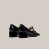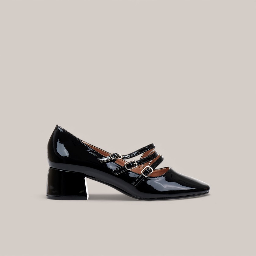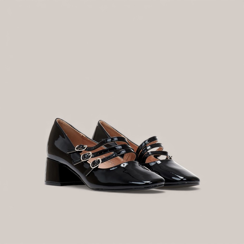 Γόβες μαύρες λουστρίνι με μπαρέτες και τετράγωνο τελείωμα