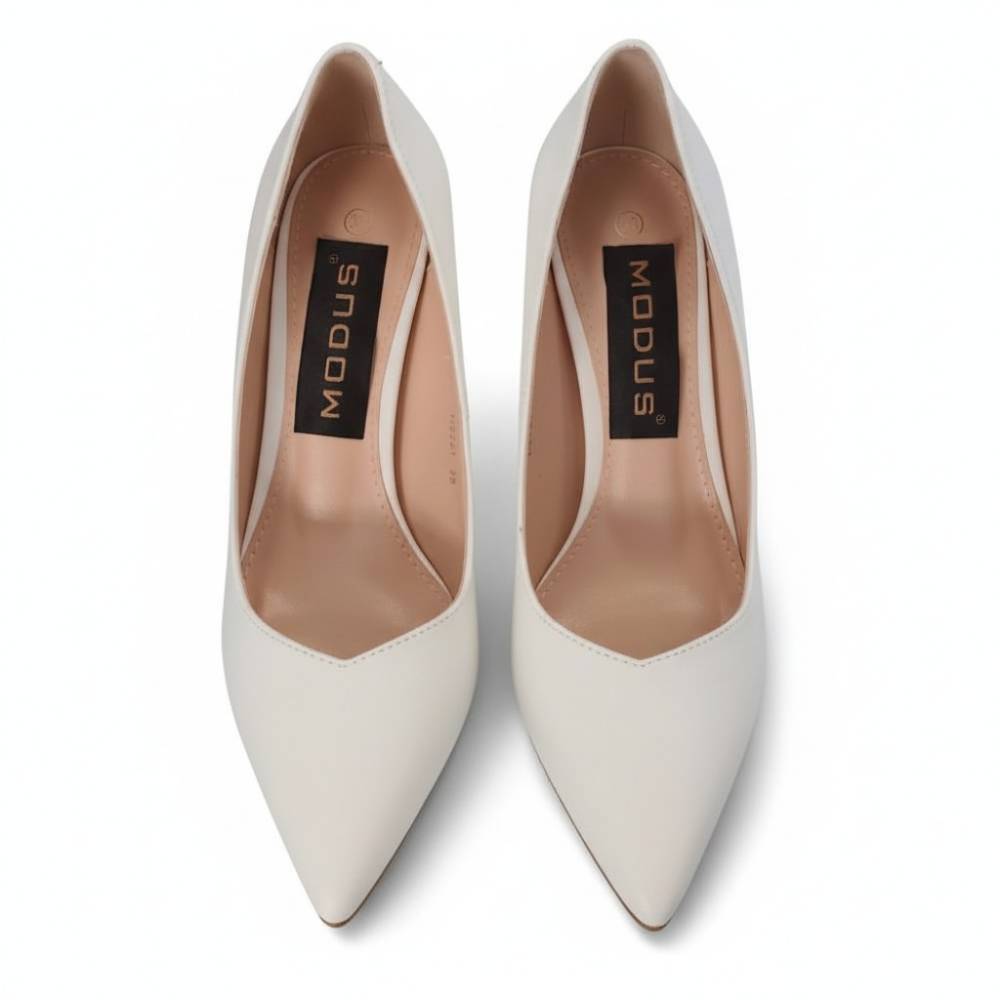 Γόβες δερματίνη σε λευκό χρώμα. Ψηλό λεπτό τακούνι. Μυτερό τελείωμα.