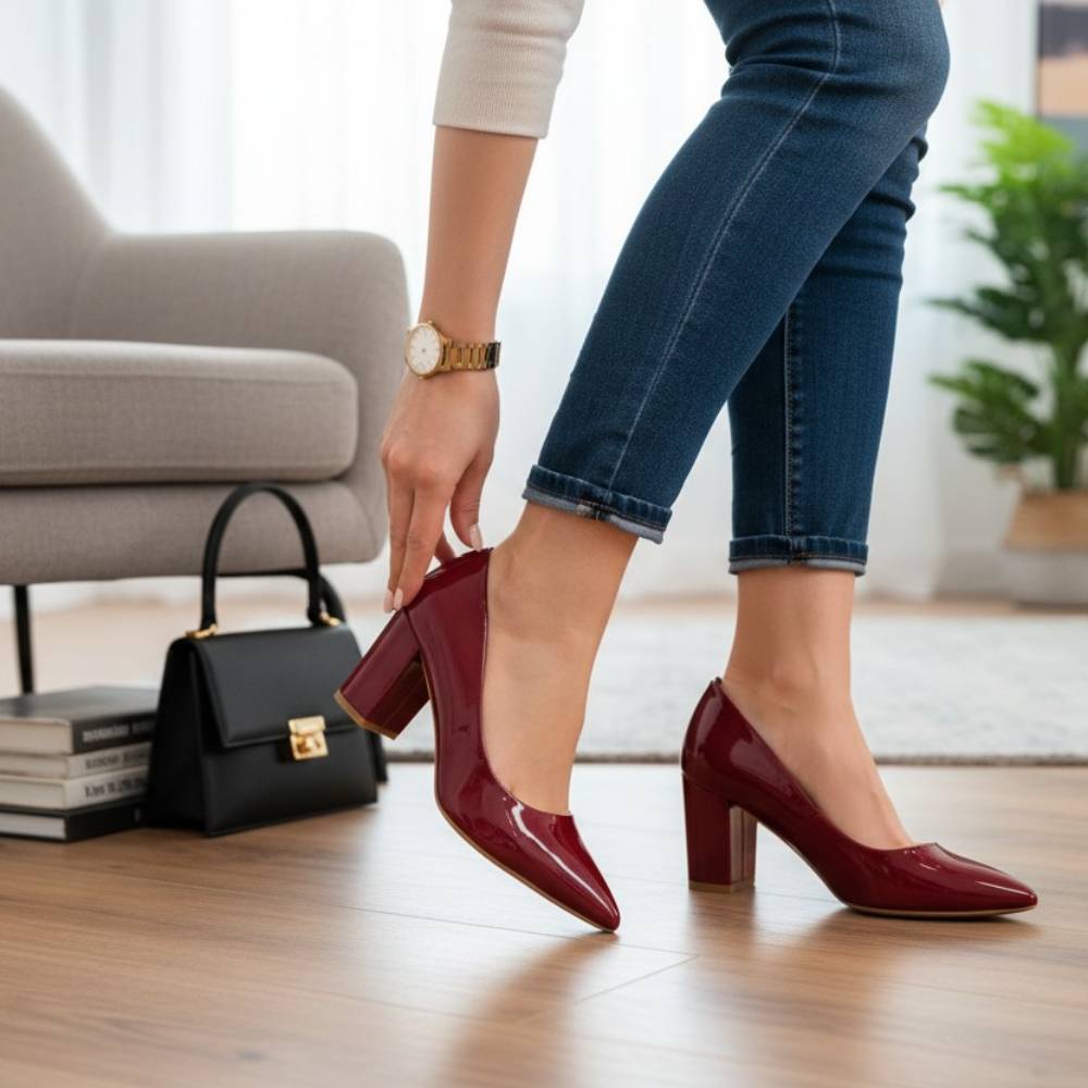 Γυναικείες γόβες λουστρίνι με χοντρό τακούνι μπορντό