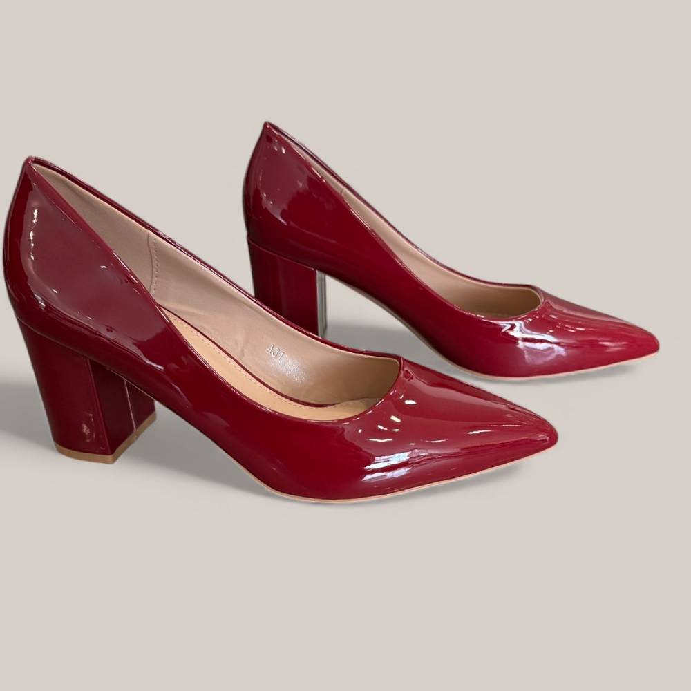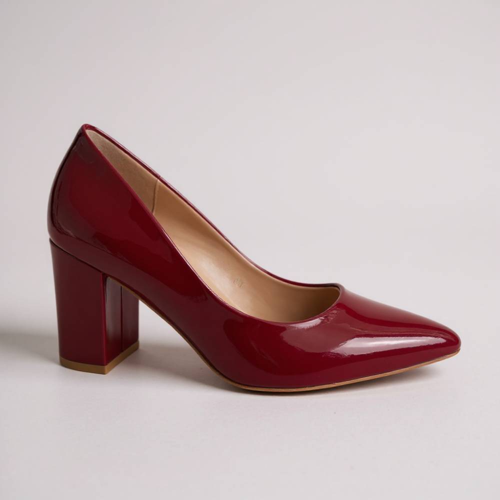 Γυναικείες γόβες λουστρίνι με χοντρό τακούνι μπορντό -