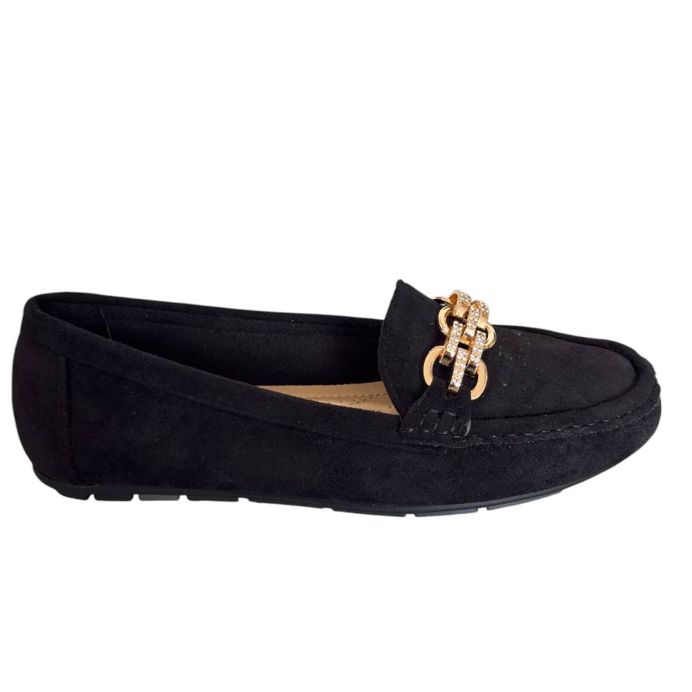 Γυναικεία μοκασίνια suede μαύρα με χρυσή αγκράφα -