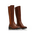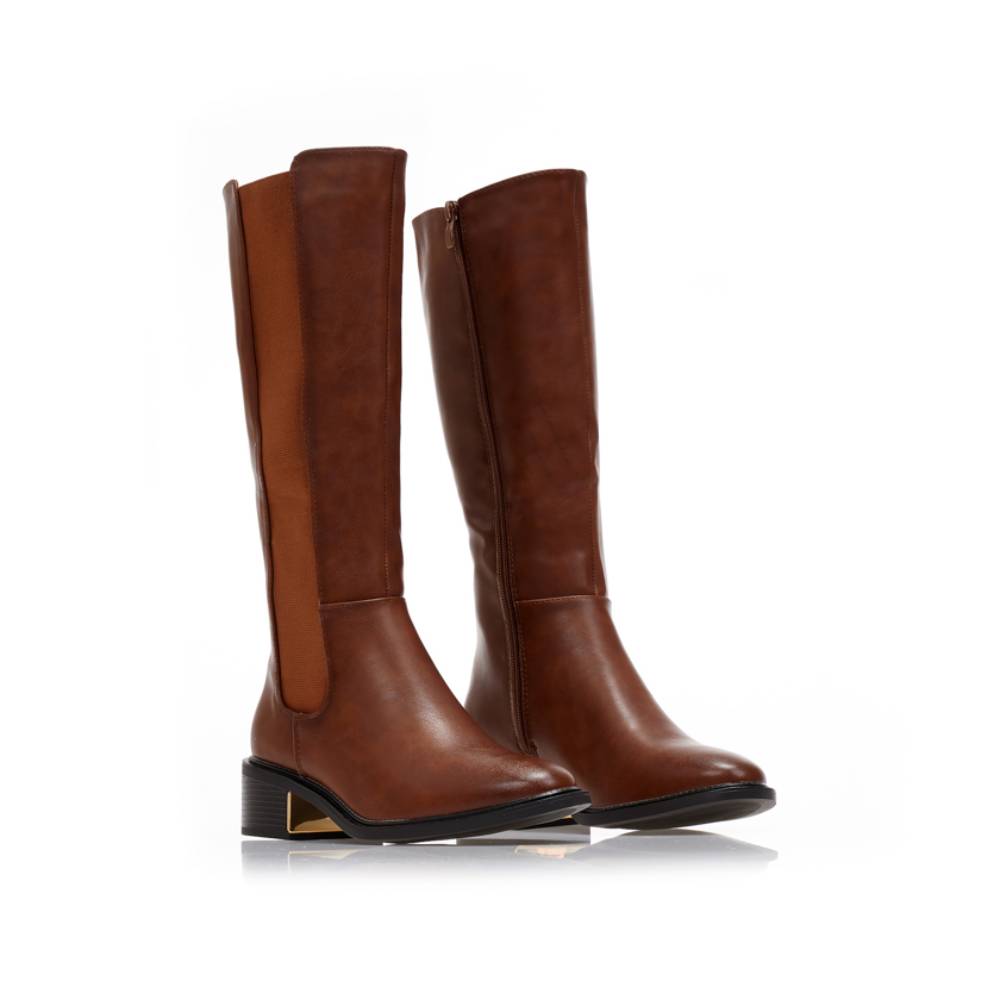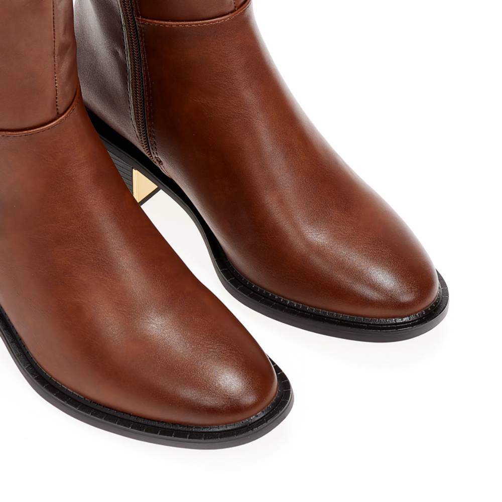 Μπότες δερματίνη σε καφέ χρώμα. Φερμουάρ στην εσωτερική πλευρά και λάστιχο στο πλάι. Χαμηλό χοντρό τακούνι. Στρογγυλό τελείωμα.