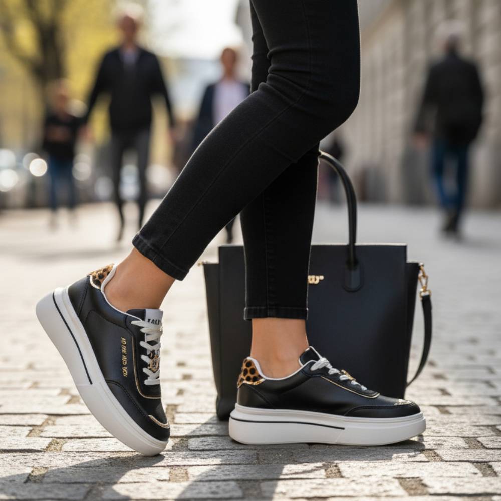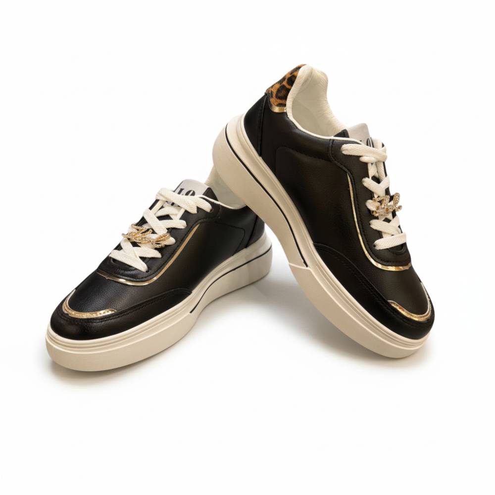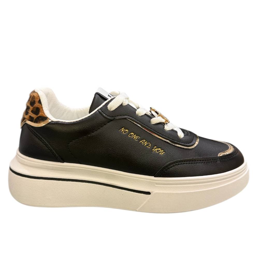 Γυναικεία sneakers μαύρα με λεοπάρ και χρυσές λεπτομέρειες